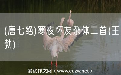 (唐七絕)寒夜懷友雜體二首(王勃)由易優(yōu)作文(易優(yōu)悅讀)為大家精心整理發(fā)布,學(xué)作文,學(xué)閱讀,提升語(yǔ)文閱讀寫(xiě)作能力,就來(lái)易優(yōu)悅讀。作文培訓(xùn),閱讀培訓(xùn),易優(yōu)悅讀助力每個(gè)孩子成為語(yǔ)文學(xué)霸。