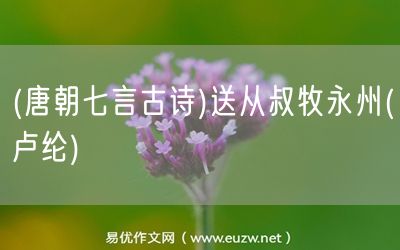 (唐朝七言古詩)送從叔牧永州(盧綸)由易優(yōu)作文(易優(yōu)悅讀)為大家精心整理發(fā)布,學(xué)作文,學(xué)閱讀,提升語文閱讀寫作能力,就來易優(yōu)悅讀。作文培訓(xùn),閱讀培訓(xùn),易優(yōu)悅讀助力每個(gè)孩子成為語文學(xué)霸。