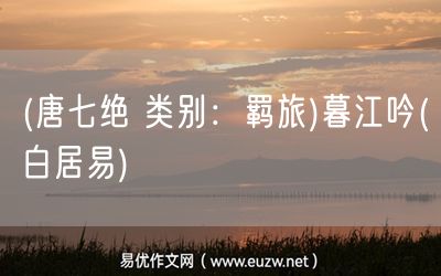 (唐七絕 類(lèi)別:羈旅)暮江吟(白居易)由易優(yōu)作文(易優(yōu)悅讀)為大家精心整理發(fā)布,學(xué)作文,學(xué)閱讀,提升語(yǔ)文閱讀寫(xiě)作能力,就來(lái)易優(yōu)悅讀。作文培訓(xùn),閱讀培訓(xùn),易優(yōu)悅讀助力每個(gè)孩子成為語(yǔ)文學(xué)霸。