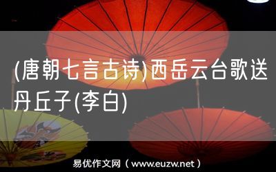 (唐朝七言古詩(shī))西岳云臺(tái)歌送丹丘子(李白)由易優(yōu)作文(易優(yōu)悅讀)為大家精心整理發(fā)布,學(xué)作文,學(xué)閱讀,提升語(yǔ)文閱讀寫作能力,就來(lái)易優(yōu)悅讀。作文培訓(xùn),閱讀培訓(xùn),易優(yōu)悅讀助力每個(gè)孩子成為語(yǔ)文學(xué)霸。 語(yǔ)文提分好幫手,易優(yōu)語(yǔ)文題庫(kù) https://cs.euzW.net