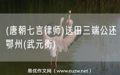 (唐朝七言律師)送田三端公還鄂州(武元衡)由易優(yōu)作文(易優(yōu)悅讀)為大家精心整理發(fā)布,學(xué)作文,學(xué)閱讀,提升語(yǔ)文閱讀寫作能力,就來(lái)易優(yōu)悅讀。作文培訓(xùn),閱讀培訓(xùn),易優(yōu)悅讀助力每個(gè)孩子成為語(yǔ)文學(xué)霸。