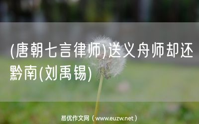 (唐朝七言律師)送義舟師卻還黔南(劉禹錫)由易優(yōu)作文(易優(yōu)悅讀)為大家精心整理發(fā)布,學(xué)作文,學(xué)閱讀,提升語文閱讀寫作能力,就來易優(yōu)悅讀。作文培訓(xùn),閱讀培訓(xùn),易優(yōu)悅讀助力每個孩子成為語文學(xué)霸。