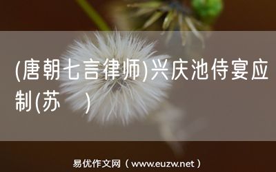 (唐朝七言律師)興慶池侍宴應(yīng)制(蘇颋)由易優(yōu)作文(易優(yōu)悅讀)為大家精心整理發(fā)布,學(xué)作文,學(xué)閱讀,提升語文閱讀寫作能力,就來易優(yōu)悅讀。作文培訓(xùn),閱讀培訓(xùn),易優(yōu)悅讀助力每個孩子成為語文學(xué)霸。