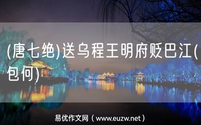 (唐七絕)送烏程王明府貶巴江(包何)由易優(yōu)作文(易優(yōu)悅讀)為大家精心整理發(fā)布,學作文,學閱讀,提升語文閱讀寫作能力,就來易優(yōu)悅讀。作文培訓,閱讀培訓,易優(yōu)悅讀助力每個孩子成為語文學霸。