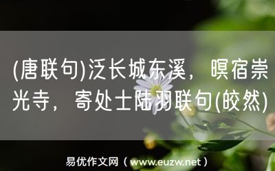 (唐聯(lián)句)泛長(zhǎng)城東溪,暝宿崇光寺,寄處士陸羽聯(lián)句(皎然)由易優(yōu)作文(易優(yōu)悅讀)為大家精心整理發(fā)布,學(xué)作文,學(xué)閱讀,提升語(yǔ)文閱讀寫作能力,就來(lái)易優(yōu)悅讀。作文培訓(xùn),閱讀培訓(xùn),易優(yōu)悅讀助力每個(gè)孩子成為語(yǔ)文學(xué)霸。