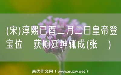 (宋)淳熙已酉二月二日皇帝登寶位镃獲廁廷紳輒成(張镃)由易優(yōu)作文(易優(yōu)悅讀)為大家精心整理發(fā)布,學(xué)作文,學(xué)閱讀,提升語(yǔ)文閱讀寫(xiě)作能力,就來(lái)易優(yōu)悅讀。作文培訓(xùn),閱讀培訓(xùn),易優(yōu)悅讀助力每個(gè)孩子成為語(yǔ)文學(xué)霸。