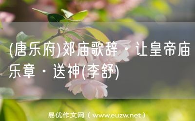 (唐樂府)郊廟歌辭·讓皇帝廟樂章·送神(李舒)由易優(yōu)作文(易優(yōu)悅讀)為大家精心整理發(fā)布,學作文,學閱讀,提升語文閱讀寫作能力,就來易優(yōu)悅讀。作文培訓,閱讀培訓,易優(yōu)悅讀助力每個孩子成為語文學霸。