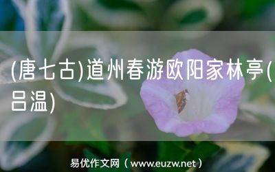 (唐七古)道州春游歐陽家林亭(呂溫)由易優(yōu)作文(易優(yōu)悅讀)為大家精心整理發(fā)布,學(xué)作文,學(xué)閱讀,提升語文閱讀寫作能力,就來易優(yōu)悅讀。作文培訓(xùn),閱讀培訓(xùn),易優(yōu)悅讀助力每個(gè)孩子成為語文學(xué)霸。
