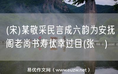 (宋)某敬采民言成六韻為安撫閣老尚書(shū)壽伏幸過(guò)目(張栻)由易優(yōu)作文(易優(yōu)悅讀)為大家精心整理發(fā)布,學(xué)作文,學(xué)閱讀,提升語(yǔ)文閱讀寫(xiě)作能力,就來(lái)易優(yōu)悅讀。作文培訓(xùn),閱讀培訓(xùn),易優(yōu)悅讀助力每個(gè)孩子成為語(yǔ)文學(xué)霸。