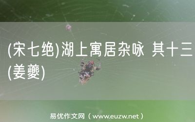 (宋七絕)湖上寓居雜詠 其十三(姜夔)由易優(yōu)作文(易優(yōu)悅讀)為大家精心整理發(fā)布,學(xué)作文,學(xué)閱讀,提升語(yǔ)文閱讀寫作能力,就來(lái)易優(yōu)悅讀。作文培訓(xùn),閱讀培訓(xùn),易優(yōu)悅讀助力每個(gè)孩子成為語(yǔ)文學(xué)霸。