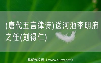 (唐代五言律詩(shī))送河池李明府之任(劉得仁)由易優(yōu)作文(易優(yōu)悅讀)為大家精心整理發(fā)布,學(xué)作文,學(xué)閱讀,提升語(yǔ)文閱讀寫作能力,就來(lái)易優(yōu)悅讀。作文培訓(xùn),閱讀培訓(xùn),易優(yōu)悅讀助力每個(gè)孩子成為語(yǔ)文學(xué)霸。