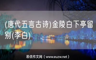 (唐代五言古詩)金陵白下亭留別(李白)由易優(yōu)作文(易優(yōu)悅讀)為大家精心整理發(fā)布,學作文,學閱讀,提升語文閱讀寫作能力,就來易優(yōu)悅讀。作文培訓,閱讀培訓,易優(yōu)悅讀助力每個孩子成為語文學霸。