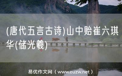 (唐代五言古詩)山中貽崔六琪華(儲光羲)由易優(yōu)作文(易優(yōu)悅讀)為大家精心整理發(fā)布,學(xué)作文,學(xué)閱讀,提升語文閱讀寫作能力,就來易優(yōu)悅讀。作文培訓(xùn),閱讀培訓(xùn),易優(yōu)悅讀助力每個(gè)孩子成為語文學(xué)霸。 易優(yōu)語文培訓(xùn),(TeL:181-1815-9898)蘇州閱讀寫作同步提升