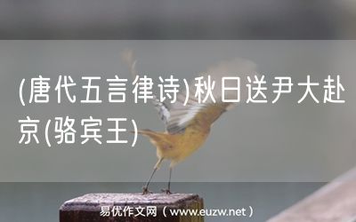 (唐代五言律詩)秋日送尹大赴京(駱賓王)由易優(yōu)作文(易優(yōu)悅讀)為大家精心整理發(fā)布,學(xué)作文,學(xué)閱讀,提升語文閱讀寫作能力,就來易優(yōu)悅讀。作文培訓(xùn),閱讀培訓(xùn),易優(yōu)悅讀助力每個孩子成為語文學(xué)霸。