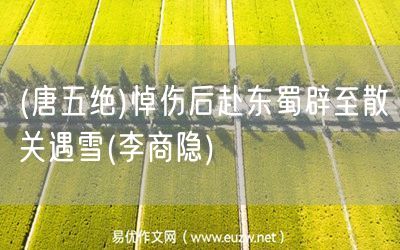 (唐五絕)悼傷后赴東蜀辟至散關(guān)遇雪(李商隱)由易優(yōu)作文(易優(yōu)悅讀)為大家精心整理發(fā)布,學(xué)作文,學(xué)閱讀,提升語(yǔ)文閱讀寫(xiě)作能力,就來(lái)易優(yōu)悅讀。作文培訓(xùn),閱讀培訓(xùn),易優(yōu)悅讀助力每個(gè)孩子成為語(yǔ)文學(xué)霸。