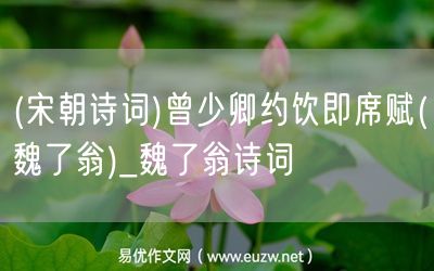 (宋朝詩(shī)詞)曾少卿約飲即席賦(魏了翁)由易優(yōu)作文(易優(yōu)悅讀)為大家精心整理發(fā)布,學(xué)作文,學(xué)閱讀,提升語(yǔ)文閱讀寫(xiě)作能力,就來(lái)易優(yōu)悅讀。作文培訓(xùn),閱讀培訓(xùn),易優(yōu)悅讀助力每個(gè)孩子成為語(yǔ)文學(xué)霸。