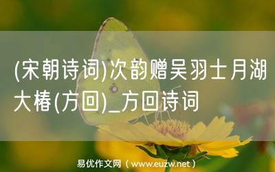 (宋朝詩詞)次韻贈吳羽士月湖大椿(方回)由易優(yōu)作文(易優(yōu)悅讀)為大家精心整理發(fā)布,學作文,學閱讀,提升語文閱讀寫作能力,就來易優(yōu)悅讀。作文培訓,閱讀培訓,易優(yōu)悅讀助力每個孩子成為語文學霸。