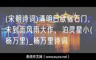 (宋朝詩詞)清明日欲宿石門,未到而風(fēng)雨大作,泊靈星小(楊萬里)由易優(yōu)作文(易優(yōu)悅讀)為大家精心整理發(fā)布,學(xué)作文,學(xué)閱讀,提升語文閱讀寫作能力,就來易優(yōu)悅讀。作文培訓(xùn),閱讀培訓(xùn),易優(yōu)悅讀助力每個(gè)孩子成為語文學(xué)霸。