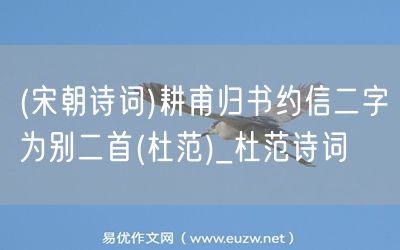 (宋朝詩(shī)詞)耕甫歸書(shū)約信二字為別二首(杜范)由易優(yōu)作文(易優(yōu)悅讀)為大家精心整理發(fā)布,學(xué)作文,學(xué)閱讀,提升語(yǔ)文閱讀寫(xiě)作能力,就來(lái)易優(yōu)悅讀。作文培訓(xùn),閱讀培訓(xùn),易優(yōu)悅讀助力每個(gè)孩子成為語(yǔ)文學(xué)霸。