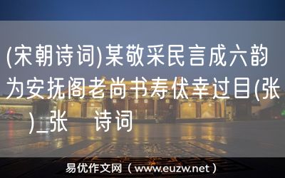 (宋朝詩詞)某敬采民言成六韻為安撫閣老尚書壽伏幸過目(張栻)由易優(yōu)作文(易優(yōu)悅讀)為大家精心整理發(fā)布,學(xué)作文,學(xué)閱讀,提升語文閱讀寫作能力,就來易優(yōu)悅讀。作文培訓(xùn),閱讀培訓(xùn),易優(yōu)悅讀助力每個孩子成為語文學(xué)霸。