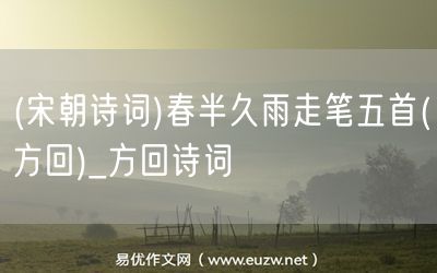 (宋朝詩(shī)詞)春半久雨走筆五首(方回)由易優(yōu)作文(易優(yōu)悅讀)為大家精心整理發(fā)布,學(xué)作文,學(xué)閱讀,提升語(yǔ)文閱讀寫(xiě)作能力,就來(lái)易優(yōu)悅讀。作文培訓(xùn),閱讀培訓(xùn),易優(yōu)悅讀助力每個(gè)孩子成為語(yǔ)文學(xué)霸。