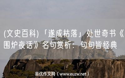 《爐夜話》是清朝咸豐人王永斌寫的。與阿明洪應(yīng)明的《財根談》和陳繼儒的《小窗秘史》并稱為“人生三大名著”?!跋卵┨?,夜深人靜的時候。一個小紅泥爐,一壺好茶,半壇清酒,當(dāng)你墜入愛河時,你會感興趣。”《爐邊夜話》應(yīng)該創(chuàng)造這樣的意境!